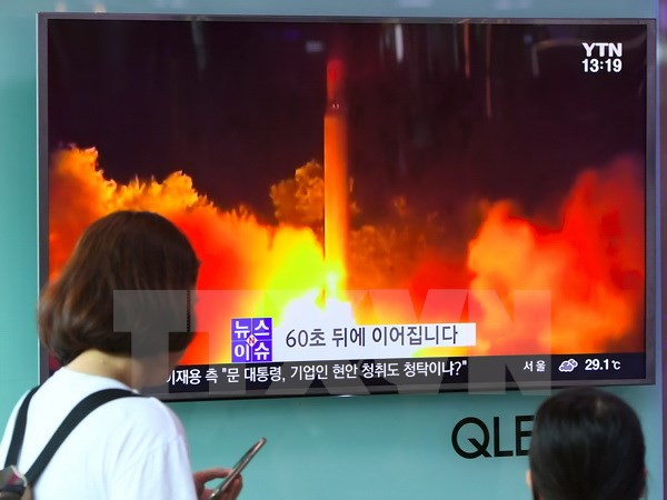 Người dân Hàn Quốc theo dõi trên truyền hình về vụ phóng thử tên lửa đạn đạo liên lục địa lần thứ hai của Triều Tiên tại một nhà ga ở Seoul ngày 29/7 vừa qua. (Ảnh: AFP/TTXVN)