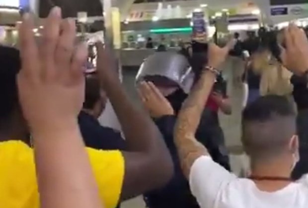 Khách mua sắm được dẫn ra khỏi trung tâm mua sắm với hai cánh tay giơ lên khi cảnh sát tiến hành tìm kiếm đối tượng tình nghi có vũ trang. (Nguồn: Twitter)