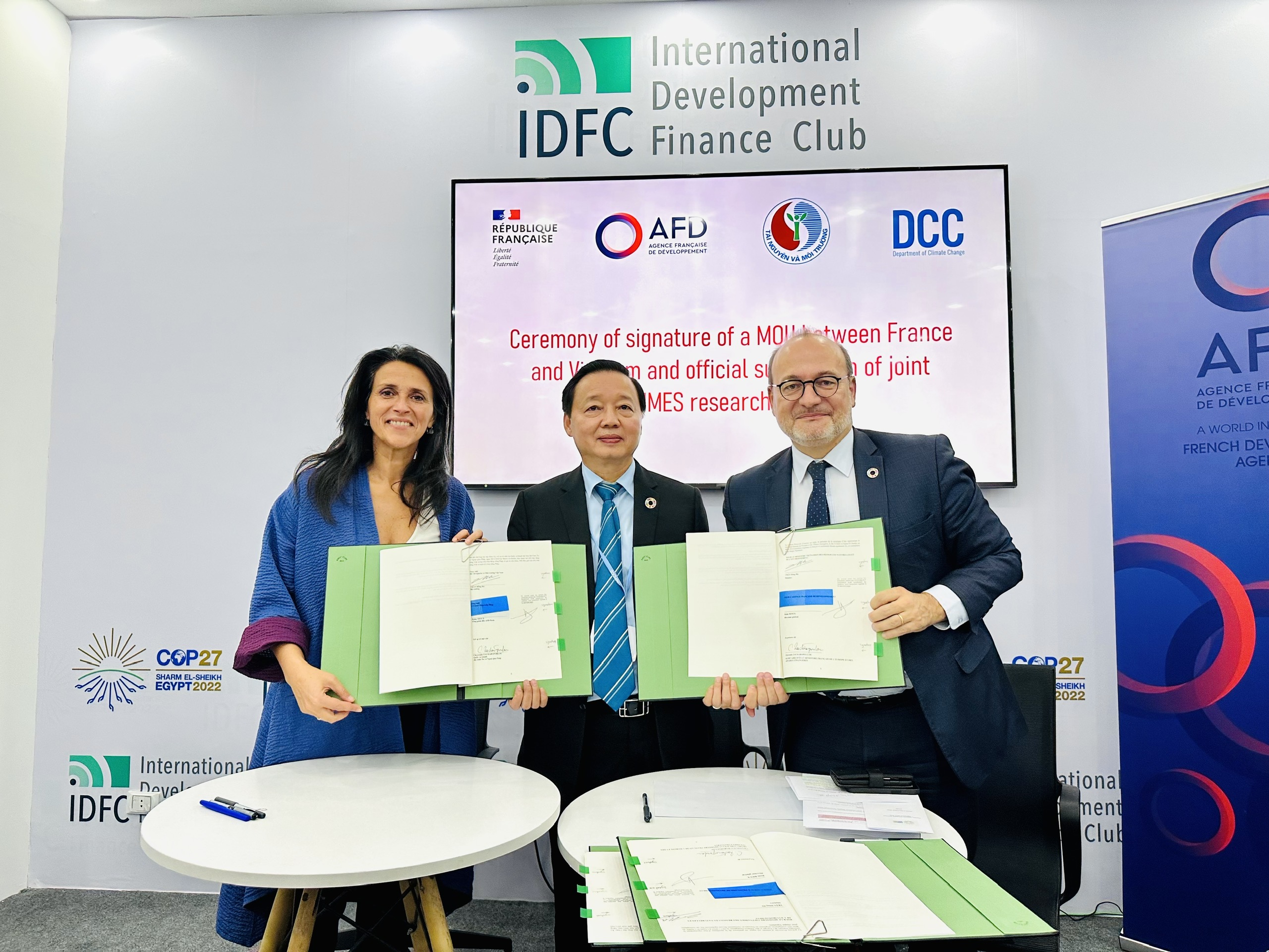 Bổ sung cho Bản ghi nhớ này, Tổng Giám đốc AFD đã chính thức trao lại Bộ trưởng Bộ Tài nguyên & Môi trường hai báo cáo nghiên cứu mới có tiêu đề: “Tác động của biến đổi khí hậu ở cấp quốc gia và thích ứng – báo cáo cuối cùng” và “Báo cáo tình trạng cấp bách của đồng bằng sông Cửu Long – Chiến lược thích ứng Môi trường và khí hậu tới năm 2050”. Được thực hiện bởi các nhà nghiên cứu Pháp và Việt Nam với sự phối hợp triển khai của IRD (Viện Nghiên cứu vì sự phát triển) và Cục Biến đổi khí hậu của Bộ Tài nguyên Môi trường, các báo cáo này trình bày những luận chứng khoa học vững vàng về lồng ghép thích ứng với biến đổi khí hậu vào các chiến lược phát triển, góp phần vào đối thoại chính sách công với Chính phủ Việt Nam. Biết rằng Chính phủ đã đặt thích ứng với biến đổi khí hậu vào vị trí trọng tâm trong chiến lược của Việt Nam.