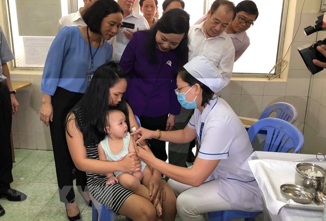 Bộ trưởng Bộ Y tế Nguyễn Thị Kim Tiến kiểm tra việc tiêm vét vắcxin sởi tại Trạm Y tế phường Linh Trung, quận Thủ Đức, Thành phố Hồ Chí Minh. (Ảnh: Đinh Hằng/TTXVN)