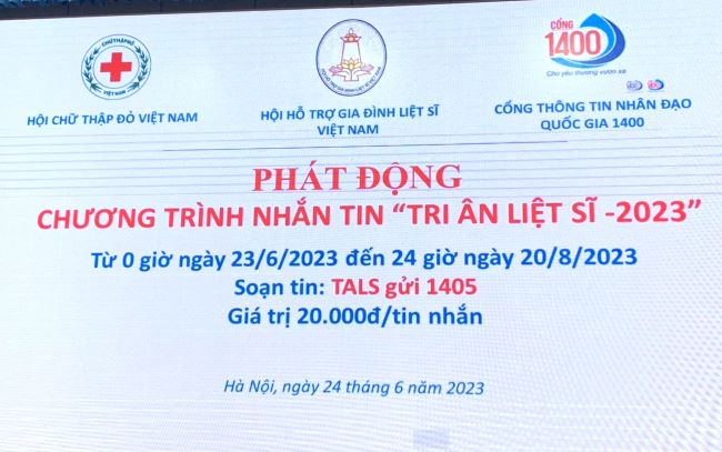 Tiến tới kỷ niệm 76 năm Ngày Thương binh Liệt sỹ (27/7), sáng 24/6, tại Hà Nội, Hội hỗ trợ gia đình liệt sỹ Việt Nam phối hợp cùng Hội Chữ Thập đỏ Việt Nam, Cổng thông tin điện tử nhân đạo quốc gia (1400) tổ chức phát động chương trình nhắn tin “Tri ân liệt sỹ- 2023”.