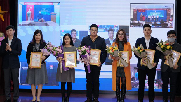 Các tác giả nhận giải báo chí về công tác đoàn và phong trào thanh thiếu nhi năm 2021. (Ảnh: CTV/Vietnam+)