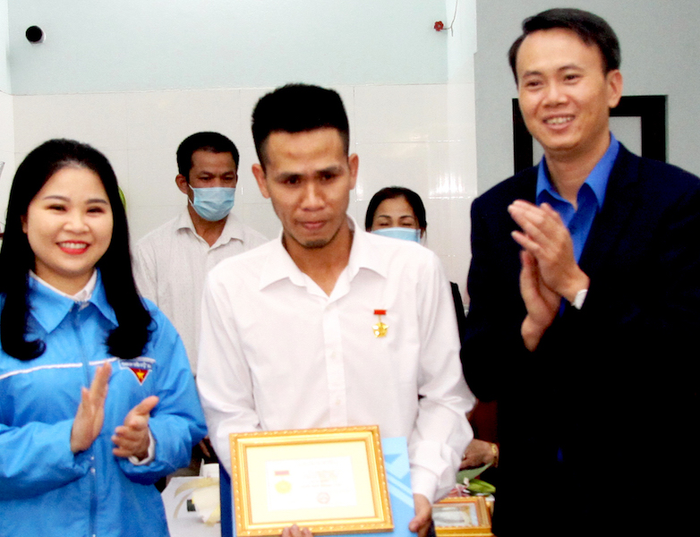 | Anh Nguyễn Ngọc Mạnh xúc động nhận Huy hiệu “Tuổi trẻ dũng cảm” của Trung ương Đoàn và Bằng khen của Đoàn Thanh niên thành phố Hà Nội - Ảnh: Vương Đức |
