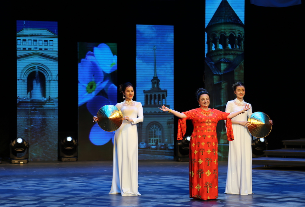 | Chương trình còn có sự góp mặt của các vị khách nước ngoài, phu nhân các đại sứ trong trang phục áo dài truyền thống Việt Nam. |
