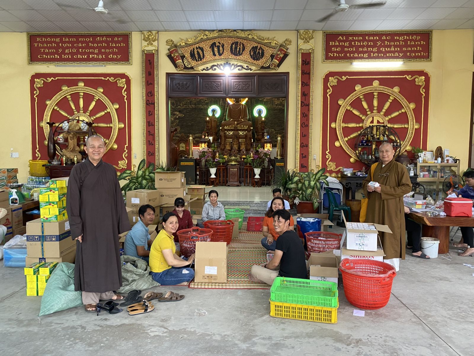 Để chuẩn bị chu đáo cho chuyến cứu trợ đồng bào miền Trung, những ngày qua, nhiều tăng, ni, phật tử đến chùa Thiên Châu (phường 3, TP.Tân An) phân chia quà, sau đó gói lại cẩn thận, sắp xếp lên xe. Công việc bắt đầu từ lúc 5 giờ đến tận 20 giờ, nhiều người cũng thấm mệt, vậy mà trên khuôn mặt ai cũng nở nụ cười hạnh phúc. Có lẽ đối với họ, sự vất vả chẳng đáng là bao khi nhìn thấy đồng bào của mình đang sống trong cảnh "màn trời chiếu đất", rất cần sự giúp đỡ của hàng triệu trái tim trên mọi miền đất nước.