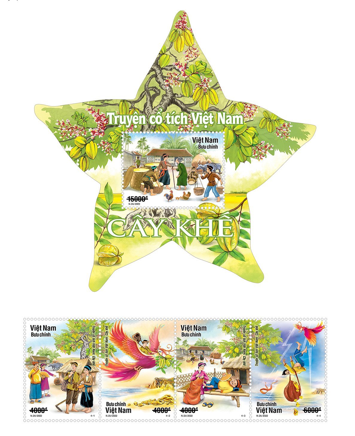 | Bộ tem "Truyện cổ tích Việt Nam: Cây khế " gồm 04 mẫu và 01 Blốc. (Ảnh: ĐT) |