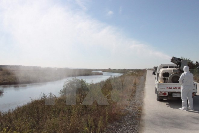 Nhân viên y tế phun thuốc khử trùng nhằm ngăn chặn sự lây lan của cúm gia cầm tại Seosan, Hàn Quốc. (Nguồn: Yonhap/TTXVN)