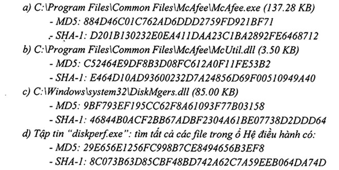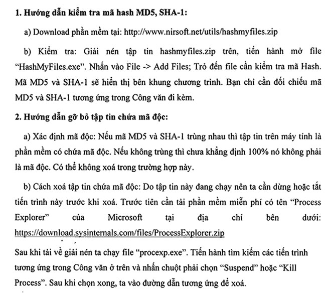 Bên cạnh đó, VNCERT cũng đưa ra hướng dẫn kiểm tra mã MD5, SHA-1 của tập tin và cách thức xóa tập tin này:
