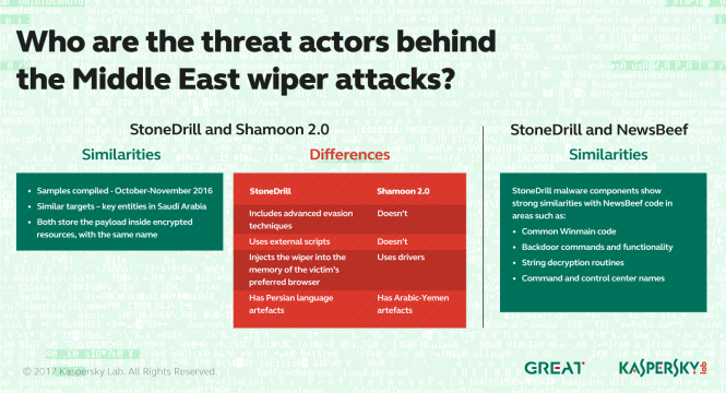 So sánh điểm giống và khác nhau giữa mã độc StoneDrill và Shamoon. - Ảnh: Kaspersky