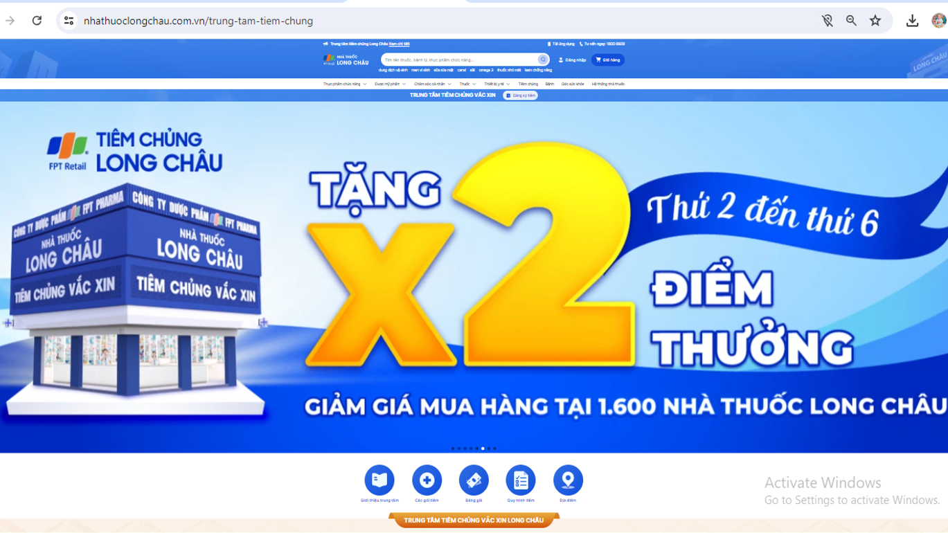 | Website của Trung tâm tiêm chủng vắc xin Long Châu. (Ảnh chụp màn hình: NP) |