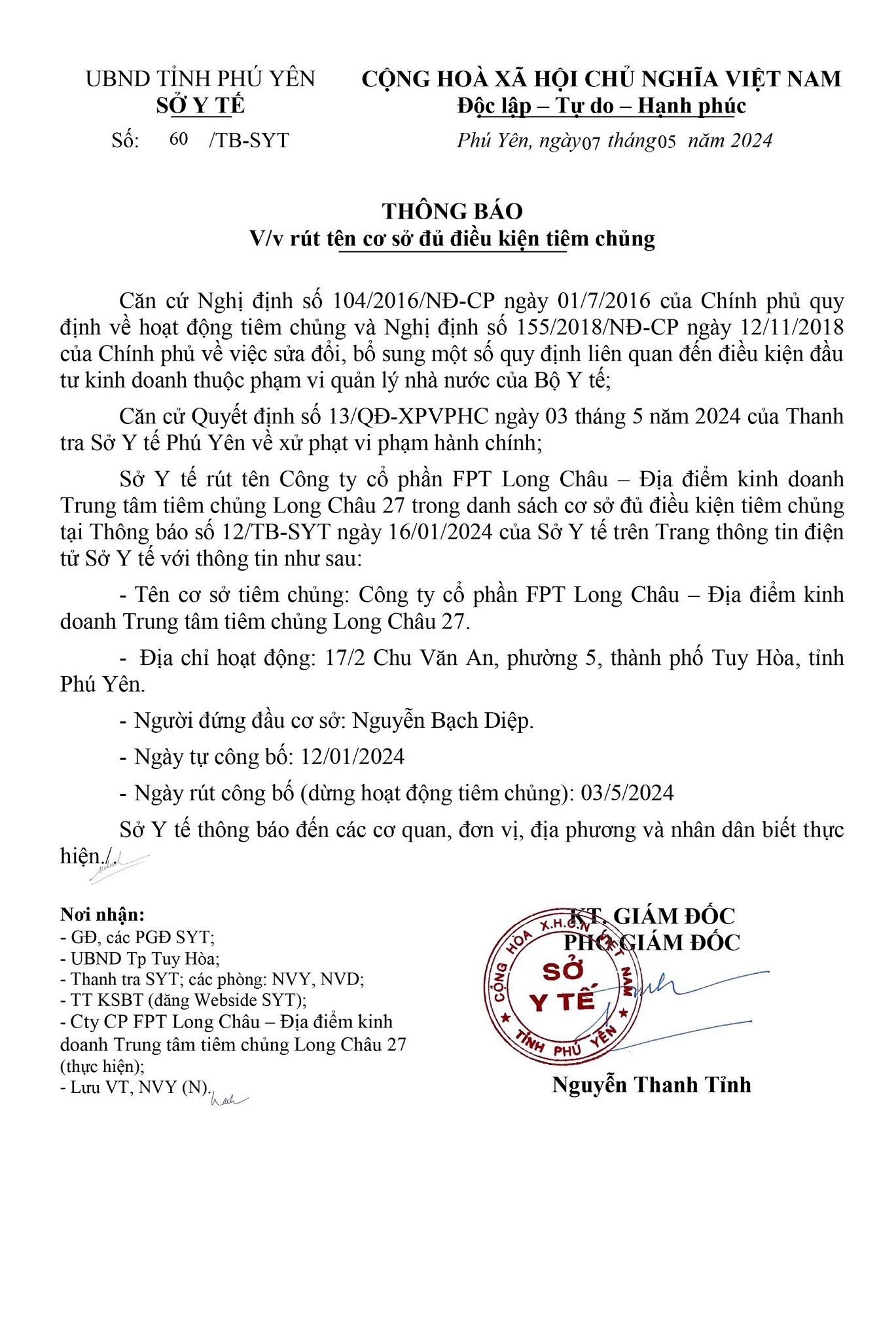 Đặc biệt, liên quan đến các vi phạm, Sở Y tế tỉnh Phú Yên cũng đã có Thông báo về việc rút tên cơ sở tiêm chủng của Công ty Cổ phần Dược phẩm FPT Long Châu.