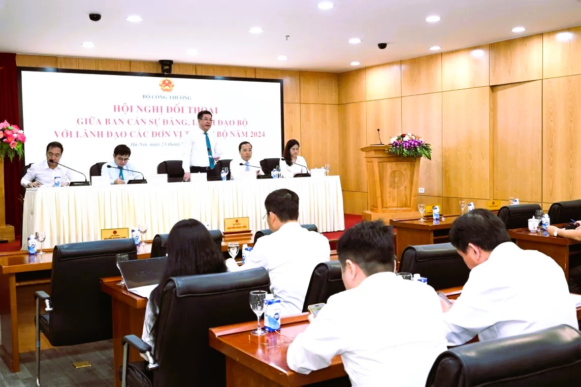 Ngày 23/7, tại Hà Nội, đã diễn ra Hội nghị đối thoại giữa Ban cán sự Đảng, lãnh đạo Bộ với lãnh đạo các đơn vị thuộc Bộ Công Thương năm 2024. Hội nghị do Công đoàn Bộ Công Thương phối hợp với Văn phòng Bộ, Vụ Tổ chức cán bộ và các đơn vị liên quan tổng hợp, xây dựng báo cáo đánh giá tình hình thực hiện cải thiện môi trường làm việc, chất lượng hiệu quả công tác và những vấn đề có liên quan đến kiến nghị, đề xuất của cán bộ, công chức, viên chức Bộ Công Thương tính đến thời điểm ngày 22/7.
