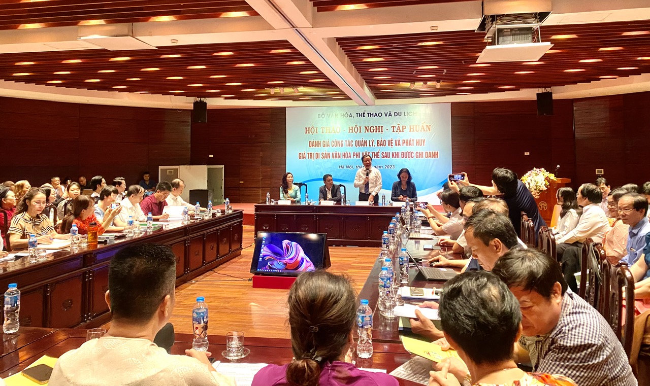 Hội thảo-Hội nghị-Tập huấn nhằm đánh giá tổng thể công tác quản lý nhà nước trong việc bảo vệ và phát huy giá trị di sản văn hóa phi vật thể trong các Danh sách của UNESCO và Danh mục quốc gia sau khi được ghi danh tới nay. Đồng thời nâng cao hiệu quả quản lý và nâng cao nhận thức của cán bộ quản lý đối với các di sản văn hóa phi vật thể được UNESCO ghi danh cũng như các di sản văn hóa phi vật thể trong Danh mục quốc gia. Từ đó xác định phương hướng, nhiệm vụ, kế hoạch triển khai trong thời gian tới để bảo vệ và phát huy giá trị di sản văn hóa phi vật thể theo cam kết tại hồ sơ đề cử với UNESCO…