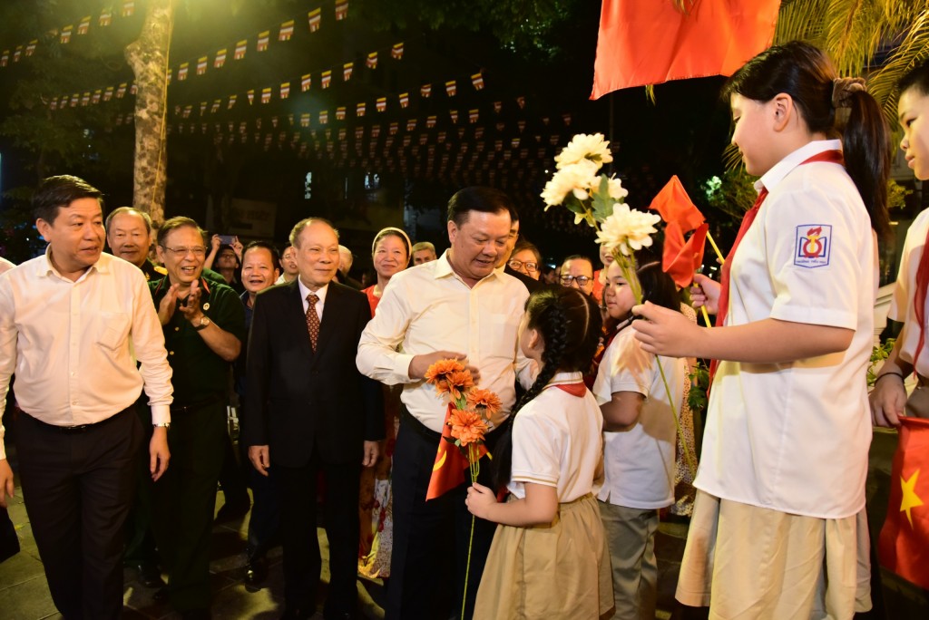 | Bí thư Thành ủy Hà Nội Đinh Tiến Dũng chung vui Ngày hội Đại đoàn kết toàn dân tộc với người dân Tổ dân phố số 3 phường Trần Hưng Đạo. |