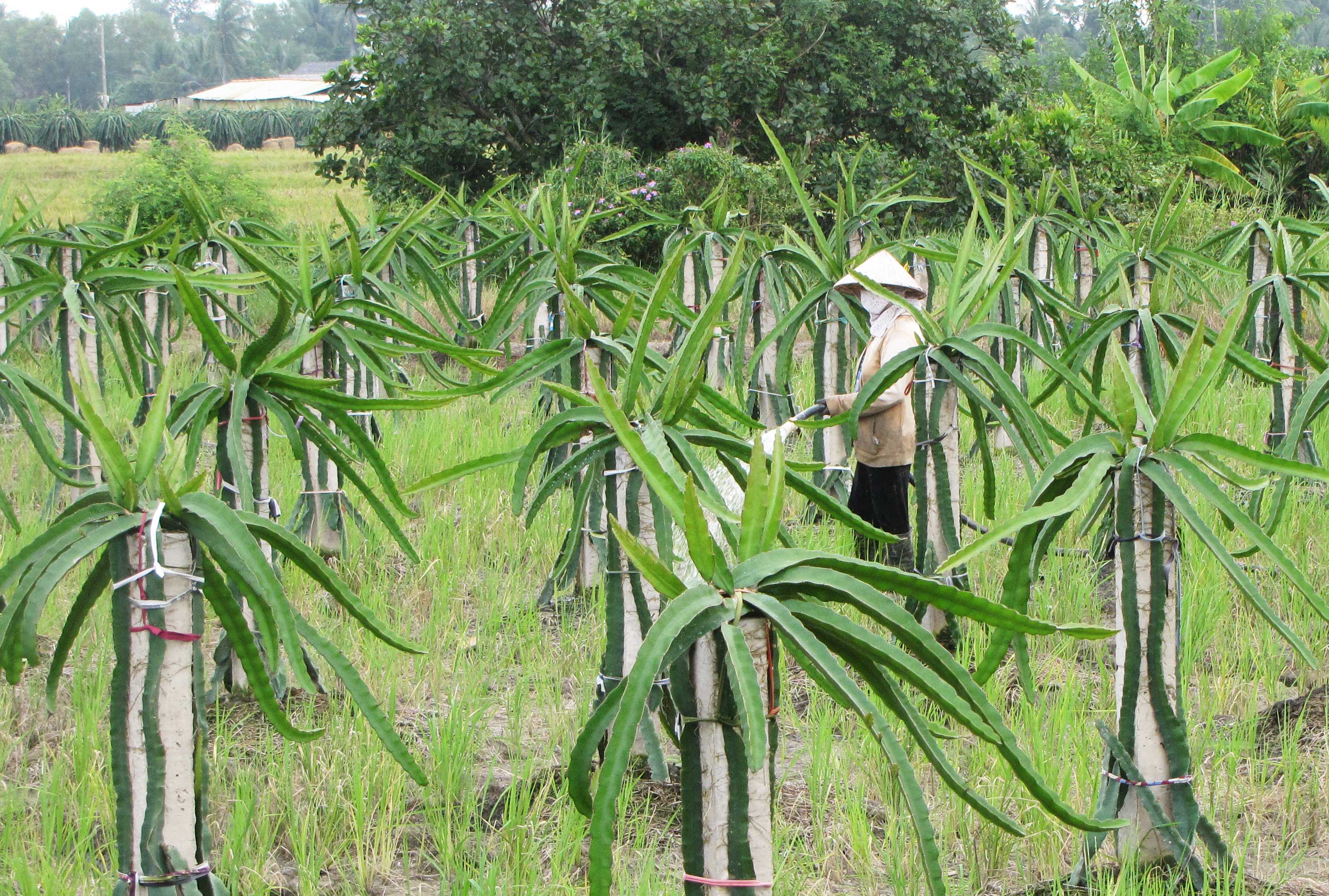 Xã viên chăm sóc thanh long ở HTX Mỹ Bình.