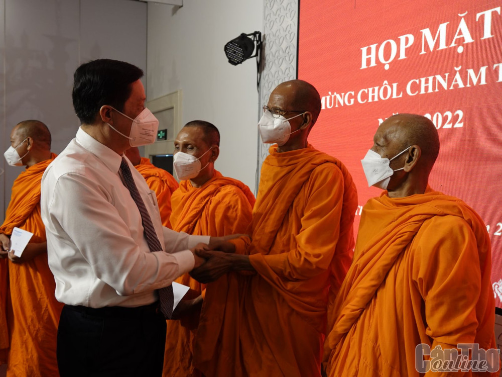 Lãnh đạo thành phố chúc mừng và tặng quà quý vị chức sắc Phật giáo Nam tông Khmer nhân dịp Tết cổ truyền Chôl Chnăm Thmây năm 2022.