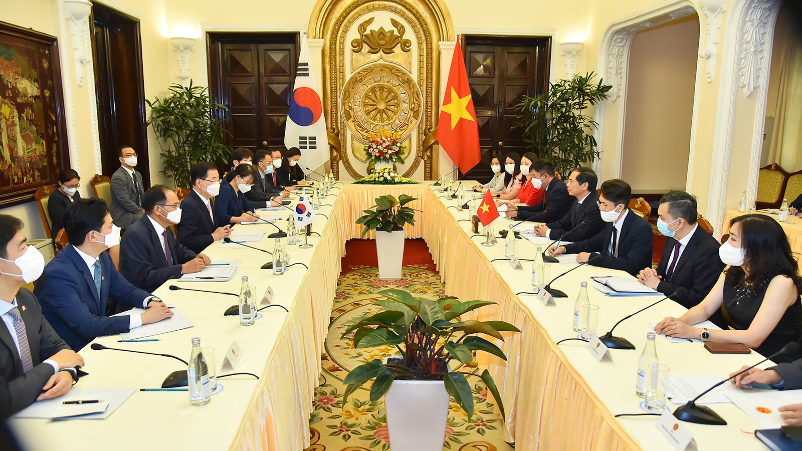 Trong bầu không khí hữu nghị, chân thành, hai Bộ trưởng Ngoại giao đã trao đổi sâu rộng về quan hệ song phương và các vấn đề quốc tế, khu vực cùng quan tâm. Hai Bộ trưởng khẳng định coi trọng duy trì và phát triển hơn nữa quan hệ Đối tác hợp tác chiến lược Việt Nam - Hàn Quốc; bày tỏ vui mừng trước những thành tựu hợp tác quan trọng mà hai nước đạt được trong nhiều lĩnh vực mặc dù gặp nhiều khó khăn do dịch bệnh COVID-19, trao đổi giữa Lãnh đạo cấp cao hai nước và các cấp được duy trì thường xuyên, hiệu quả và linh hoạt, tin cậy được củng cố, hiểu biết lẫn nhau được tăng cường. Hai Bộ trưởng cũng nhất trí hai Bộ Ngoại giao tăng cường phối hợp chặt chẽ, thúc đẩy tổng thể hợp tác song phương trên các lĩnh vực theo tinh thần thỏa thuận giữa Lãnh đạo cấp cao hai nước, góp phần đưa quan hệ Đối tác hợp tác chiến lược Hàn Quốc - Việt Nam phát triển lên tầm cao mới; tăng cường hơn nữa giao lưu cấp cao, thúc đẩy hợp tác giữa các ngành, địa phương; hợp tác phòng chống đại dịch COVID-19; mở rộng hợp tác đầu tư, thương mại, hỗ trợ phát triển; bảo hộ công dân.