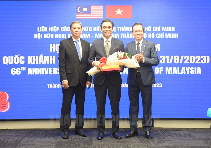 | Đai diện Hội hữu nghị Việt Nam – Malaysia TPHCM tặng hoa chúc mừng Tổng Lãnh sự Malaysia tại TPHCM Firdauz Bin Othman (Ảnh: thanhuytphcm.vn) |
