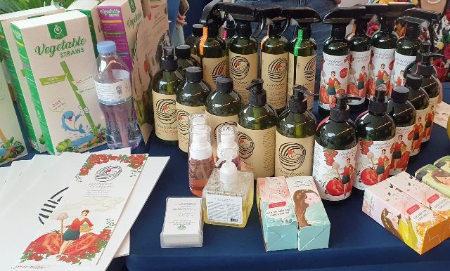 | Một số sản phẩm nông nghiệp thân thiện môi trường được giới thiệu ngoài khuôn viên Hội thảo (Ảnh: HNV) |