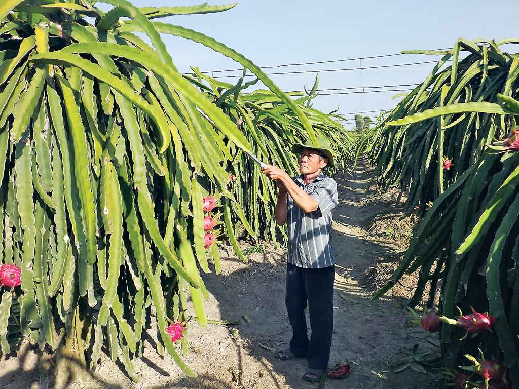 Chuyển đổi cơ cấu cây trồng mang lại hiệu quả cao (Trong ảnh: Nông dân xã Phú Ngãi Trị, huyện Châu Thành trồng thanh long mang lại hiệu quả cao)