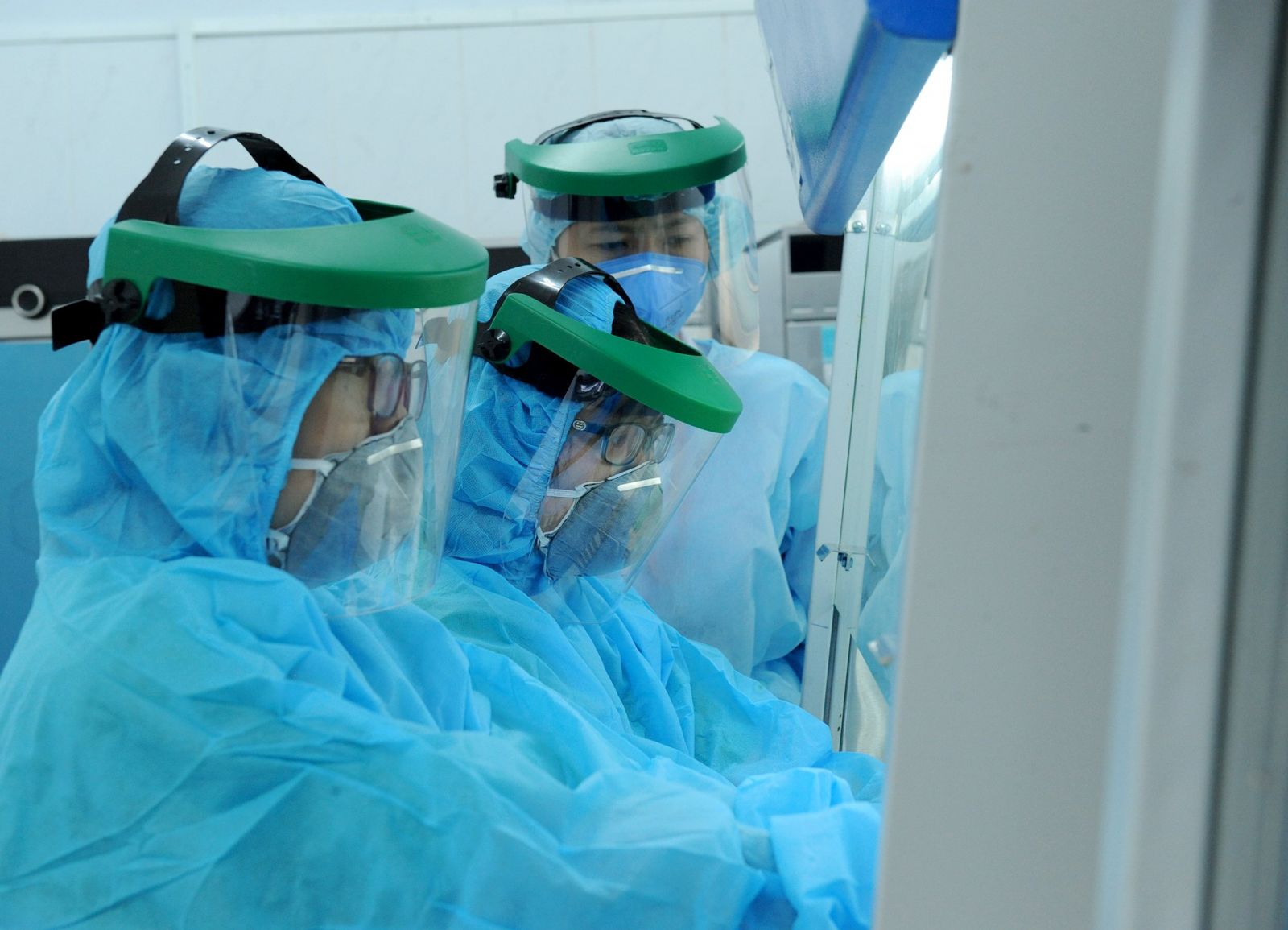 Chị Nguyễn Thị Thu Hiền (đứng) cùng các đồng nghiệp tất bật với công việc lấy mẫu, xét nghiệm