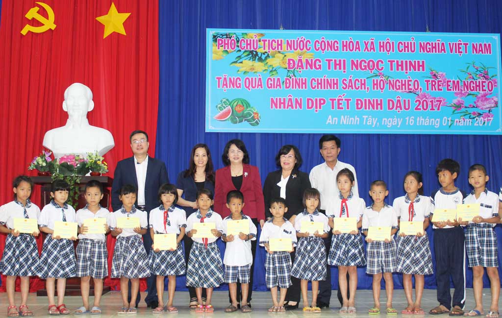 Nhân dịp Tết Nguyên đán Đinh Dậu 2017, Phó Chủ tịch nước – Đặng Thị Ngọc Thịnh gửi lời thăm hỏi, chúc mừng năm mới đến với các gia đình chính sách, người có công với cách mạng, hộ nghèo, trẻ em có hoàn cảnh đặc biệt khó khăn và nhân dân 2 xã. Phó Chủ tịch nước mong rằng, trong thời gian tới, huyện Đức Hòa nói riêng, tỉnh Long An nói chung tiếp tục phát triển kinh tế-xã hội, chăm lo tốt hơn nữa đời sống vật chất, tinh thần của người dân địa phương./.