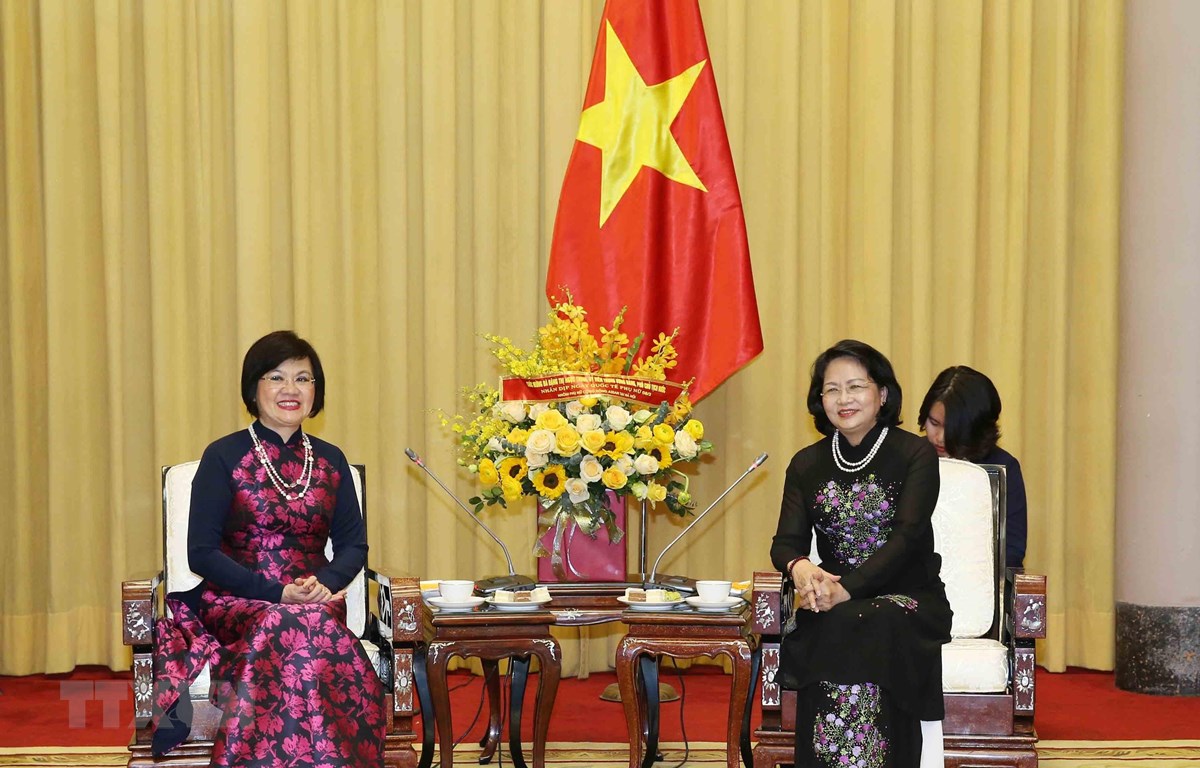 Phó Chủ tịch nước Đặng Thị Ngọc Thịnh với Đại sứ Nguyễn Nguyệt Nga, Chủ tịch danh dự Nhóm Phụ nữ Cộng đồng ASEAN tại Hà Nội. Ảnh: Phương Hoa/TTXVN)