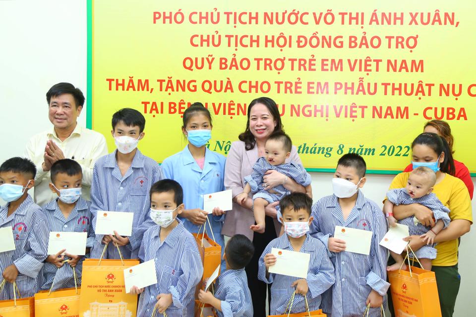 Ngày 23/8, đồng chí Võ Thị Ánh Xuân, Phó Chủ tịch nước, Chủ tịch Hội đồng Bảo trợ Quỹ Bảo trợ trẻ em Việt Nam (Quỹ Bảo trợ trẻ em Việt Nam) đến thăm và tặng quà cho trẻ em điều trị và phẫu thuật khe hở môi, vòm miệng, u nang vùng hàm mặt tại bệnh viện Hữu nghị Việt Nam-Cu Ba (Hà Nội).