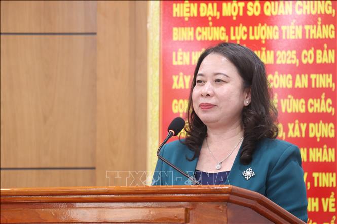 | Phó Chủ tịch nước Võ Thị Ánh Xuân phát biểu tại chuyến thăm, tặng quà chúc mừng năm mới lực lượng Công an tỉnh Long An (Ảnh: TTXVN) |
