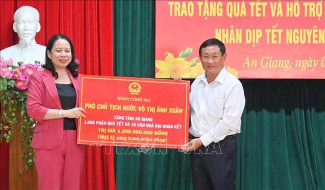 | Phó Chủ tịch nước Võ Thị Ánh Xuân và Đoàn công tác đã trao 1.000 phần quà Tết tặng các gia đình chính sách có hoàn cảnh khó khăn, hộ nghèo, cận nghèo, hộ khó khăn; tặng biểu trưng 10 căn nhà đại đoàn kết cho tỉnh An Giang |
