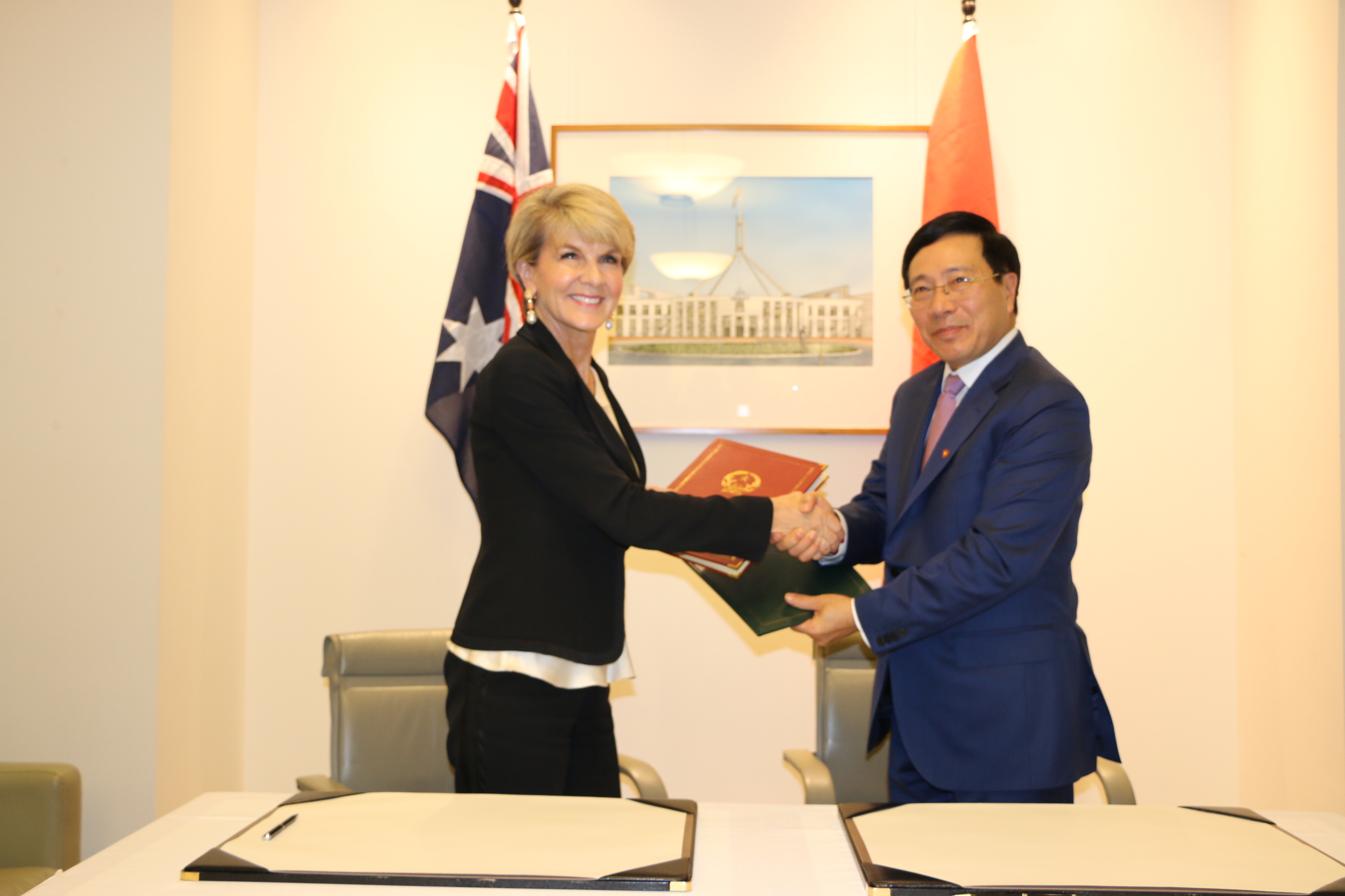 Sau hội đàm, Phó Thủ tướng, Bộ trưởng Phạm Bình Minh và Bộ trưởng Julie Bishop đã ký kết Chương trình hành động Việt Nam - Australia giai đoạn 2016-2019. Chương trình hành động là văn kiện toàn diện, cụ thể hóa các mục tiêu và biện pháp trong các lĩnh vực hợp tác song phương và đa phương giữa hai nước, nhằm đưa quan hệ Đối tác toàn diện tăng cường giữa Việt Nam và Australia tiếp tục phát triển trong thời gian tới./.