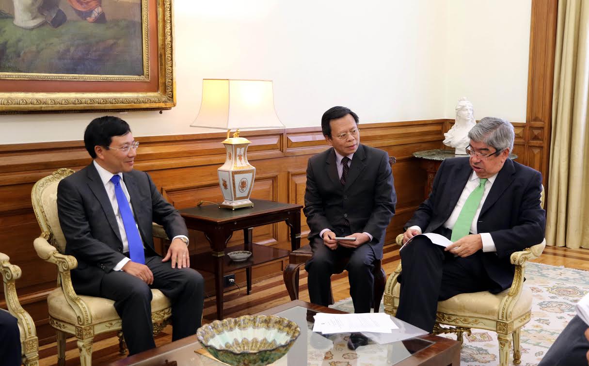 Phó Thủ tướng, Bộ trưởng Phạm Bình Minh đánh giá cao vai trò của Bồ Đào Nha trong Liên minh châu Âu (EU) cũng như trong việc tham gia giải quyết các vấn đề chung của cộng đồng quốc tế; đề nghị hai nước tiếp tục ủng hộ lẫn nhau tại các diễn đàn đa phương như Liên hợp quốc, ASEM, EU – ASEAN cũng như Đại hội đồng Liên nghị viện thế giới (IPU), Đối tác Nghị viện Á – Âu (ASEP)…. Phó Thủ tướng đề nghị Quốc hội Bồ Đào Nha ủng hộ và khuyến khích doanh nghiệp Bồ Đào Nha tăng cường hợp tác kinh doanh và đầu tư tại Việt Nam; khẳng định Việt Nam luôn tạo điều kiện thuận lợi cho hoạt động của doanh nghiệp nước ngoài tại Việt Nam.