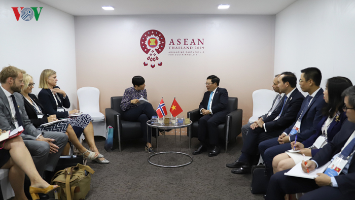 Tại cuộc gặp với Bộ trưởng Ngoại giao Na Uy E. Soreide, Phó Thủ tướng Phạm Bình Minh và Bộ trưởng Soreide bày tỏ vui mừng trước sự phát triển tích cực của quan hệ hai nước thời gian qua, nhất trí thúc đẩy đàm phán Hiệp định Thương mại tự do giữa Việt Nam với Khối Mậu dịch tự do châu Âu (EFTA).