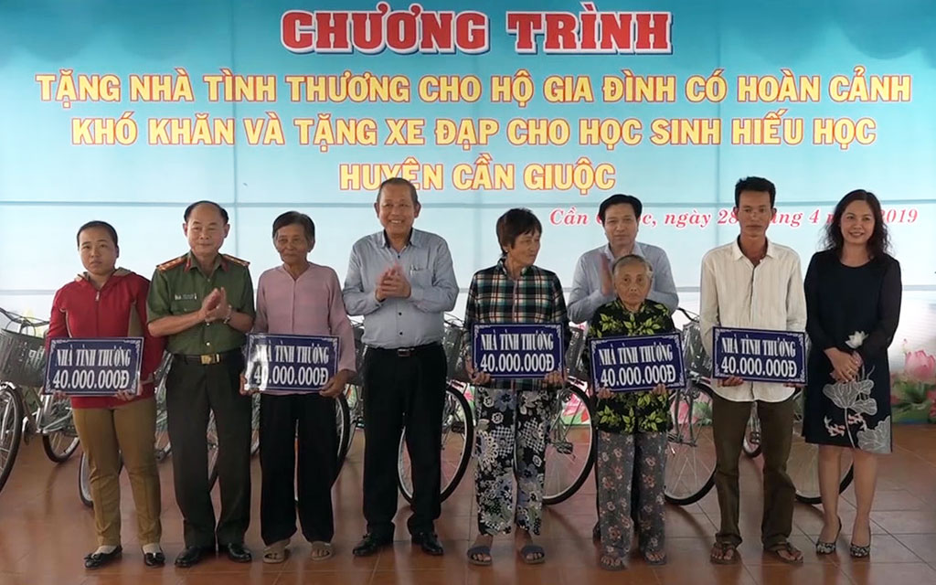 Ngày 28/4, Phó Thủ tướng Thường trực Chính phủ - Trương Hòa Bình trao 10 căn nhà tình thương và 25 xe đạp cho các gia đình có hoàn cảnh khó khăn về nhà ở và học sinh nghèo hiếu học trên địa bàn huyện Cần Giuộc, tỉnh Long An.