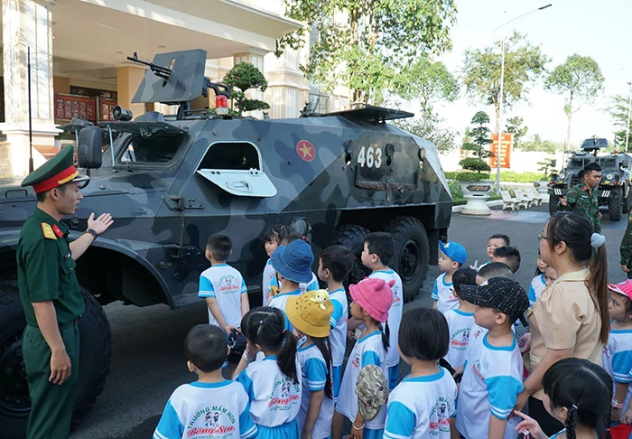 Trung úy Phan Văn Tài, Phó Bí thư Ðoàn cơ sở Phòng Tham mưu, Bộ CHQS thành phố giới thiệu về xe thiết giáp BTR-152 với các học sinh đến tham quan Bộ CHQS thành phố nhân dịp kỷ niệm 79 năm Ngày thành lập Quân đội Nhân dân Việt Nam.