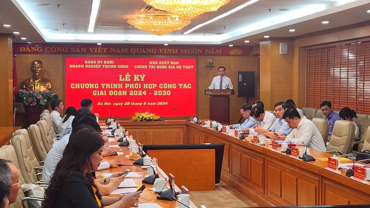 | Tại buổi Lễ, Bí thư Đảng ủy Khối Doanh nghiệp Trung ương Nguyễn Long Hải và Giám đốc, Tổng biên tập Nhà xuất bản Chính trị quốc gia Sự thật Vũ Trọng Lâm đã ký Chương trình phối hợp công tác giai đoạn 2024 - 2030 |