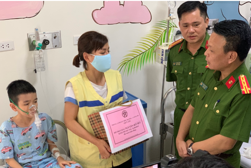 Thay mặt PC05, đồng chí Đại tá Trần Anh Tuấn - Bí thư Đảng ủy, Trưởng phòng Cảnh sát môi trường CATP Hà Nội cùng đoàn công tác đã trao số tiền hỗ trợ cho gia đình 2 bệnh nhi Nguyễn Đức Huy 10 tuổi, quê ở Lai Châu và Tạ Văn Dũng, 7 tuổi, quê ở Thái Nguyên, mỗi suất trị giá 30 triệu đồng. Ngoài ra, đoàn cũng thăm, tặng quà cho 03 cháu khác cùng phòng bệnh, mỗi cháu 1 triệu đồng.