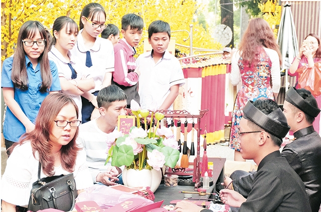 Hơn 50 gian hàng được bố trí dọc các tuyến đường này, phổ biến nhất là những gian hàng trưng bày câu đối, liễn, ông đồ ngồi viết thư pháp. Nhiều bạn trẻ tỏ ra thích thú, hào hứng, kiên nhẫn ngồi chờ ông đồ nắn nót từng nét chữ chúc Xuân, cầu mong một năm mới yên bình, nhiều niềm vui, may mắn.