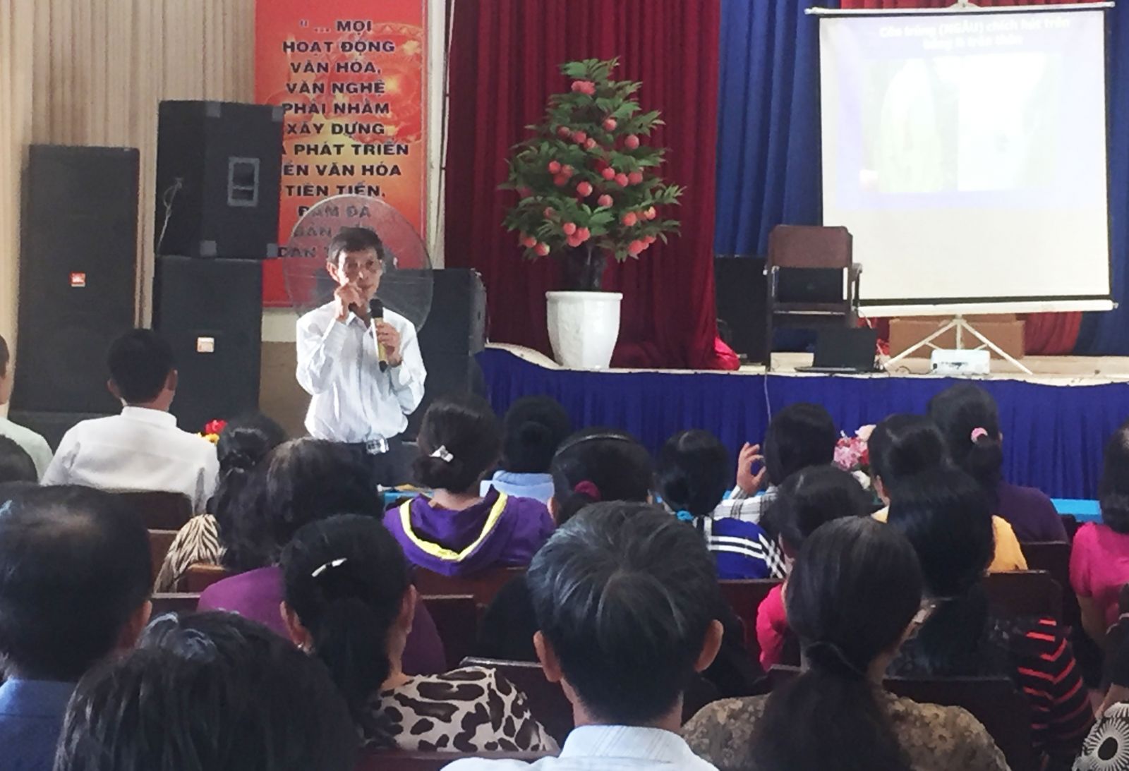 Tại hội thảo, TS.Hồ Minh Chiến hướng dẫn nông dân kỹ thuật chăm sóc và phòng trừ sâu bệnh trên cây thanh long. Trong đó, Tập đoàn An Nông cũng giới thiệu đến nông dân danh mục thuốc do đơn vị sản xuất nhằm phòng ngừa, điều trị một số bệnh chính của loại cây trồng này.