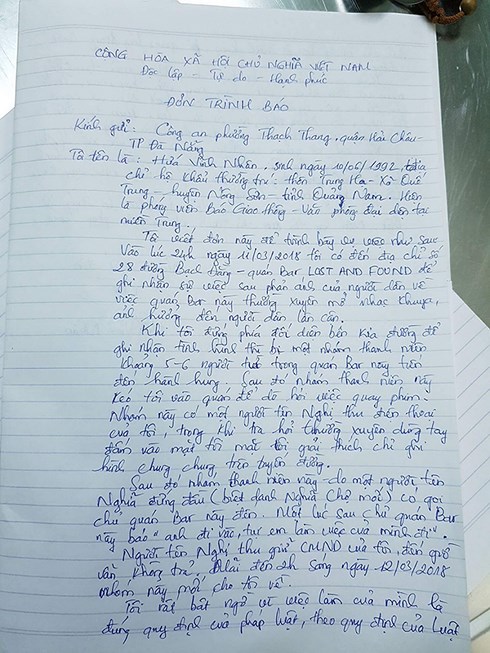 Đơn trình báo vụ việc của phóng viên Hứa Vĩnh Nhân