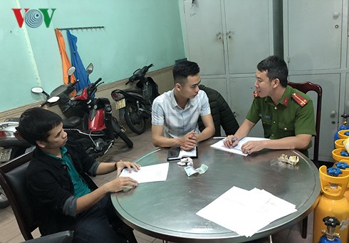 Phóng viên Hứa Vĩnh Nhân (giữa) trình báo vụ việc với Công an phường Thạch Thang, quận Hải Châu, TP Đà Nẵng