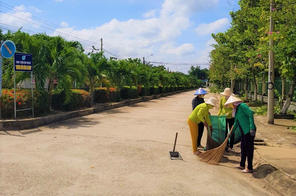 Hội viên phụ nữ xã Khánh Hưng, huyện Vĩnh Hưng hào hứng tham gia quét dọn, vệ sinh các tuyến đường trên địa bàn
