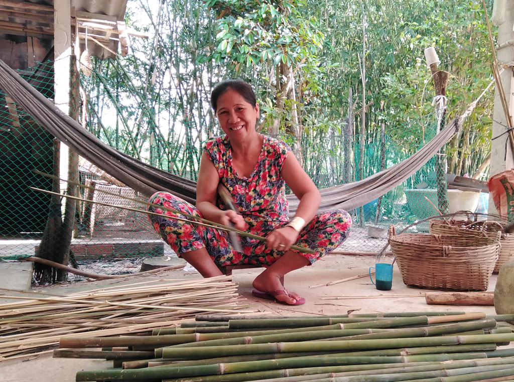 Lúc mới cưới nhau, vợ chồng anh chị bắt đầu tạo dựng sự nghiệp bằng đôi bàn tay trắng. Ban ngày, anh chị làm thuê, buổi tối thì đan cần xé kiếm thêm thu nhập. Khó khăn lại chồng chất khó khăn khi 2 người con của anh chị lần lượt ra đời. Không nản lòng, anh chị cố gắng lao động, dành dụm tiền mua đất làm ruộng. Hiện nay, gia đình chị có hơn 1ha đất canh tác lúa và đậu phộng. Ngoài ra, chị còn chăn nuôi thêm gia cầm, bò nền để tăng thu nhập. Đặc biệt, hiện nay, chị mở rộng nghề đan cần xé tại nhà và tạo thêm việc làm cho chị em trong xóm. Vợ chồng chị cũng xây dựng được ngôi nhà khang trang, nuôi dạy các con nên người. Hiện tại, con gái lớn của chị có gia đình riêng, kinh tế ổn định. Con trai út là giáo viên của một trường THPT trên địa bàn huyện. Không chỉ chăm lo phát triển kinh tế gia đình, chị còn tích cực tham gia các phong trào của hội ở địa phương.