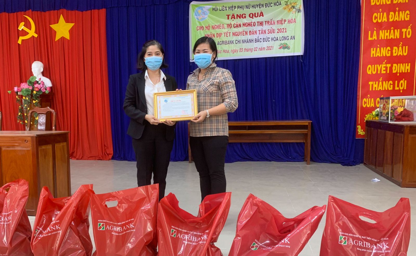Theo đó, Hội Liên hiệp Phụ nữ Việt Nam huyện Đức Hoà vận động Ngân hàng Nông nghiệp và Phát triển nông thôn chi nhánh Bắc Đức Hoà, tặng 65 phần quà cho hộ nghèo, hộ cận nghèo trên địa bàn thị trấn Hiệp Hoà, huyện Đức Hoà, tổng giá trị 19,5 triệu đồng.