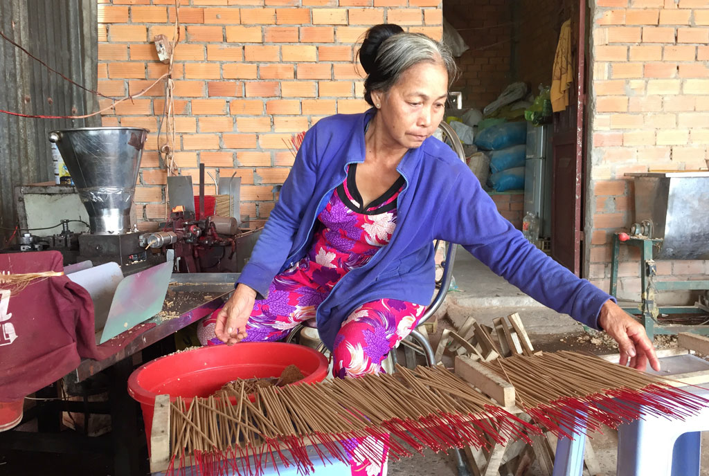 Tận dụng thời gian nhàn rỗi, bà Đoàn Thị Hồng xe nhang để tăng thêm thu nhập cho gia đình