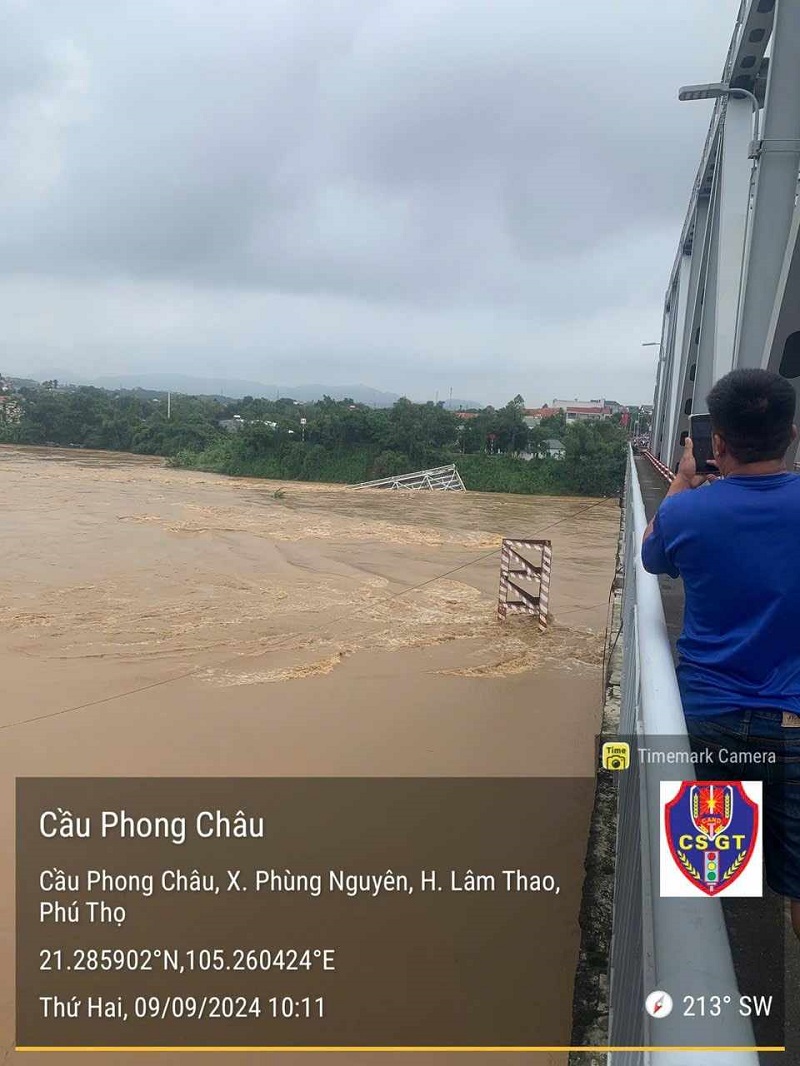 | Do nước lũ dâng cao, chảy siết, nên cầu Phong Châu trên Quốc lộ 32C thuộc Phú Thọ bị sập trôi 1 mố cầu bên địa phận huyện Tam Nông. Công an tỉnh Phú Thọ đang tập trung lực lượng phân luồng và cứu hộ cứu nạn. (Ảnh: Cục CSGT) |