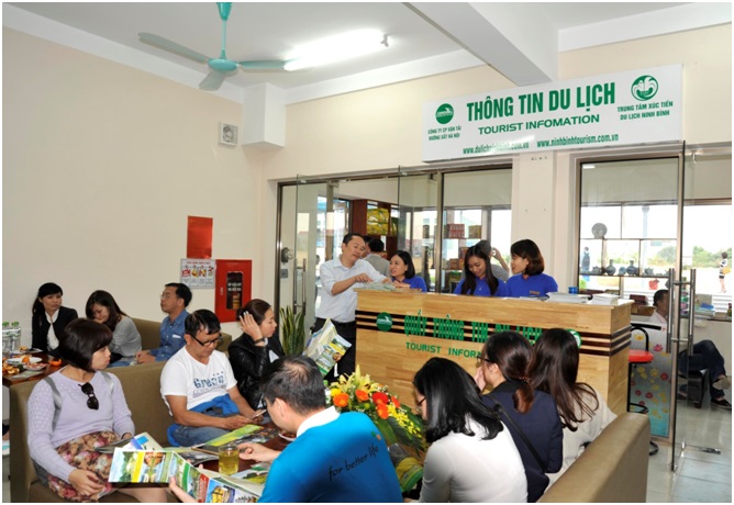 | Hành khách tại phòng mua vé và tìm hiểu thông tin du lịch tại ga Hà Nội. |