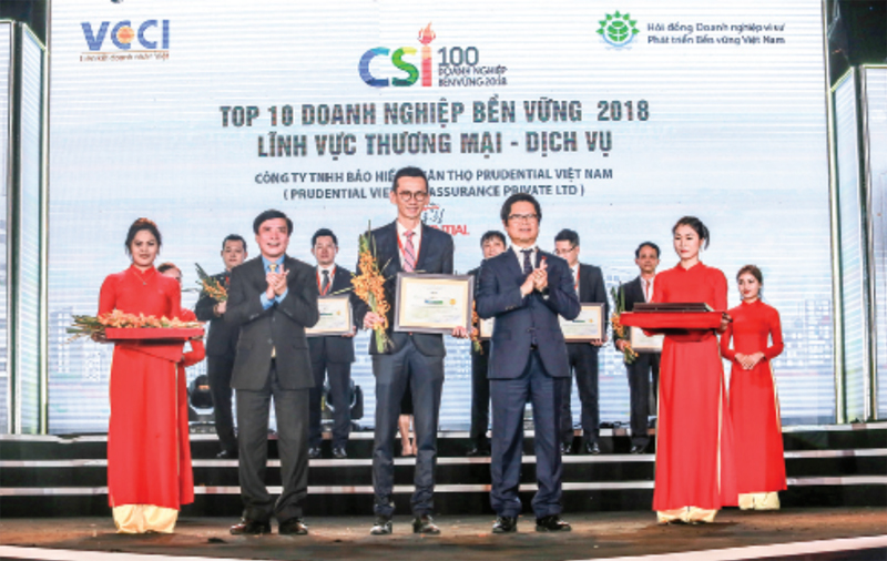 Ngày 22 tháng 11 năm 2018 - tại khách sạn Sheraton Hà Nội, Công ty Bảo hiểm Nhân thọ Prudential Việt Nam (Prudential) được vinh danh trong “Top 10 Doanh nghiệp bền vững tại Việt Nam” năm 2018, nhóm ngành Thương mại - Dịch vụ. Giải thưởng là minh chứng cho nỗ lực phát triển bền vững của Prudential, không chỉ trong hoạt động kinh doanh mà còn qua những đóng góp thiết thực cho cộng đồng cùng cam kết lâu dài về “Thích ứng với biến đổi khí hậu và bảo vệ môi trường”.