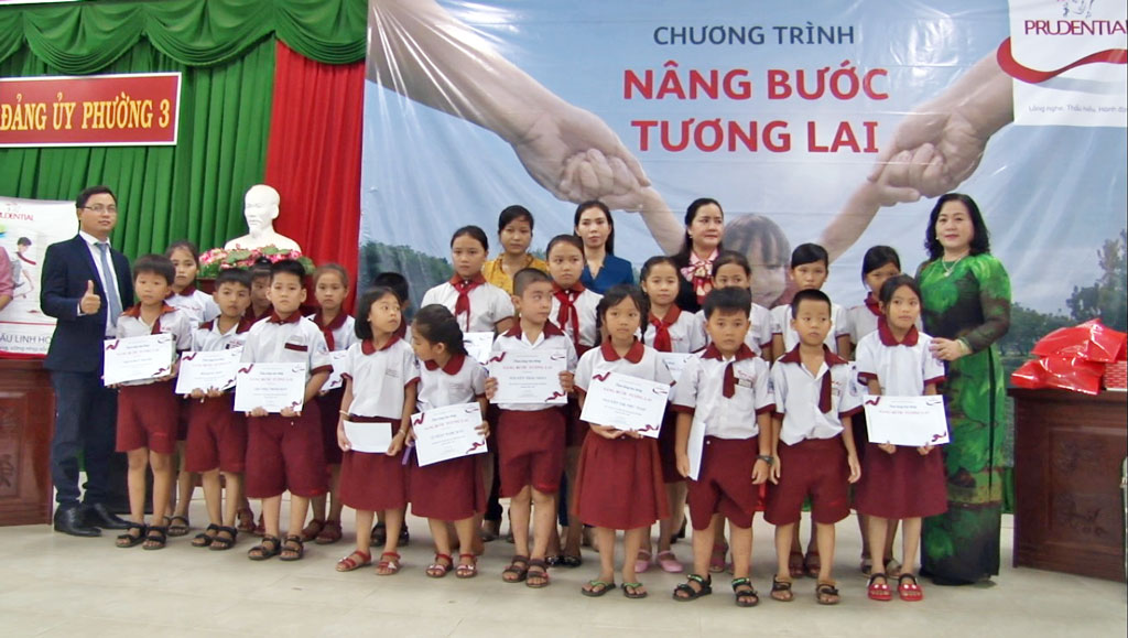 Tại buổi lễ, đại diện Công ty TNHH Bảo hiểm nhân thọ Prudential Việt Nam trao 20 suất học bổng, mỗi suất trị giá 1 triệu đồng nhằm động viên các em vượt qua khó khăn, cố gắng học tập tốt hơn nữa.