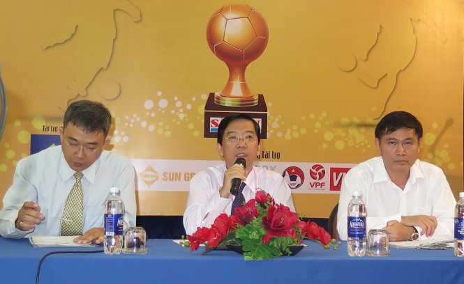 Nhà báo Nguyễn Thành Lợi (giữa) – phó Tổng biên tập báo SGGP, trưởng ban tổ chức giải thưởng Quả bóng vàng 2015 trả lời trong cuộc họp báo vào sáng 23-11. Ảnh: S.H